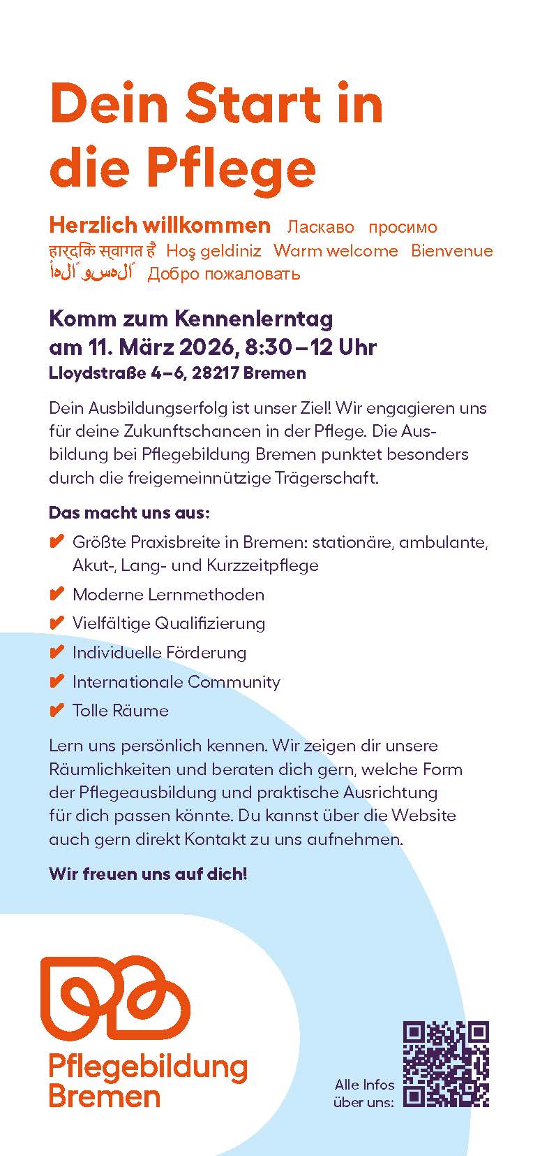 Als zentrale Ausbildungseinrichtung für Pflegeberufe in der Hansestadt gestaltet 'Pflege-bildung Bremen' die Zukunft angehender Pflegefachpersonen. Kooperiert wird eng mit zahlreichen Krankenhäusern sowie Pflegeeinrichtungen der Region. An einer Pflegeausbildung Interessierte sind zum ersten Tag der offenen Tür nach dem Umzug des Ausbildungszentrums ins Kaffeequartier eingeladen, die fröhlich gestalteten Räumlichkeiten zu entdecken und die moderne Lernumgebung persönlich kennenzulernen. Auch Schüler*innen der Mittel- oder Oberstufe, die sich eine Zukunft in der Pflege vorstellen können, erhalten an diesem Vormittag wertvolle Einblicke in das erfüllende und zukunftssichere Berufsbild Pflege.