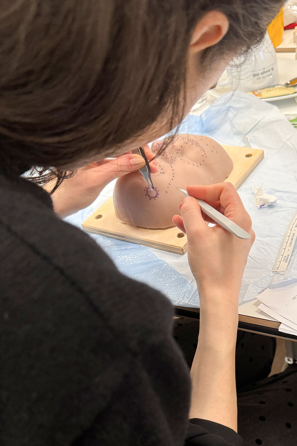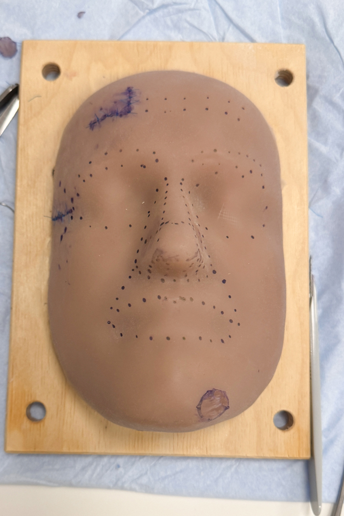 Ein besonderer Schwerpunkt lag auf der praktischen Anwendung: Die Teilnehmenden konnten die erlernten Techniken direkt an speziellen Gesichtsmodellen aus Silikon ausprobieren. So wurden die einzelnen Schritte – vom präzisen Zuschnitt des Gewebes bis zur spannungsfreien Deckung des Defekts – anschaulich nachvollziehbar.