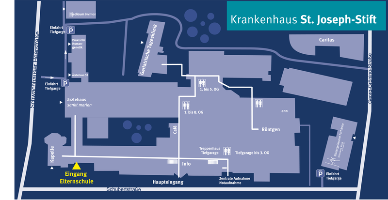 Das persönliche Anmeldegespräch findet dann in unserer Elternschule statt (Eingang von der Schubertstraße aus rechts neben der Kapelle, siehe Lageplan).